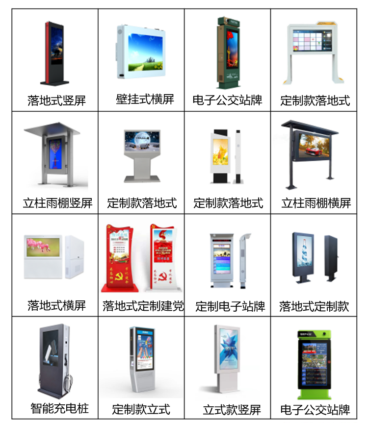 按外觀:戶外液晶廣告機(jī)豎放落地式、戶外液晶廣告機(jī)橫放落地式,戶外液晶廣告機(jī)橫放背掛式,戶外液晶廣告機(jī)豎放背掛式,戶外液晶廣告機(jī)拼接式